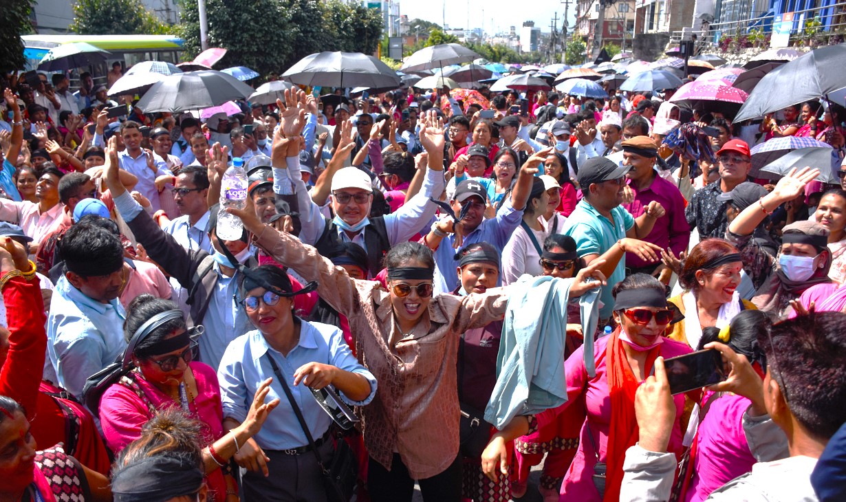 राहत शिक्षक अझै सडकमा, नाचगानसहित निधारमा कालो पट्टि बाँधेर विरोध