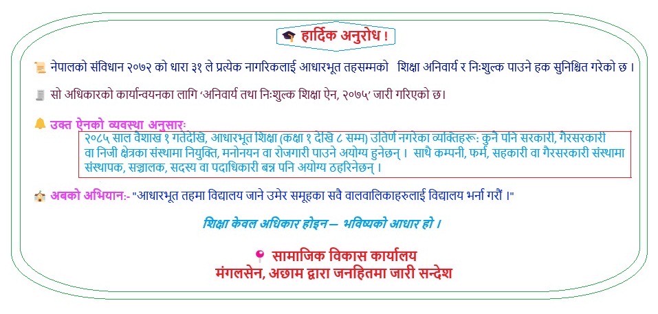 अछाम । वल्र्डभिजन ईन्टरनेश्नल नेपालद्धारा अछाममा सञ्चालित विभिन्न परियोजनाहरुको जिल्ला स्तरिय समिक्षा सदरमुकाम मंगलसैनमा सम्पन्न भएको छ । वल्र्डभिजन ईन्टरनेश्नल नेपालका साझेदार संस्था वाक नेपाल अछाम र आस्था नेपालको साझेदारीमा सञ्चालित ४ वटा परियोेजनाको समिक्षा भएको हो ।
